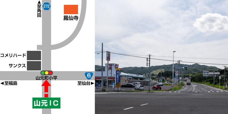 仙台市側からの場合、仙台東インターより仙台東部道路にて山元IC(1時間ほど)から一般道に降りていただき、以下詳細の通りお越しください。